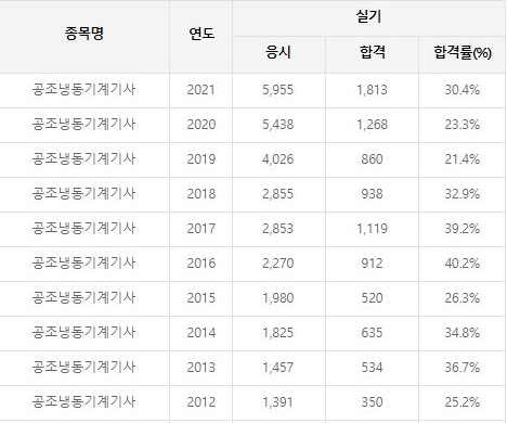 최근 10년의 공조냉동기계기사 실기 합격률의 동향입니다.